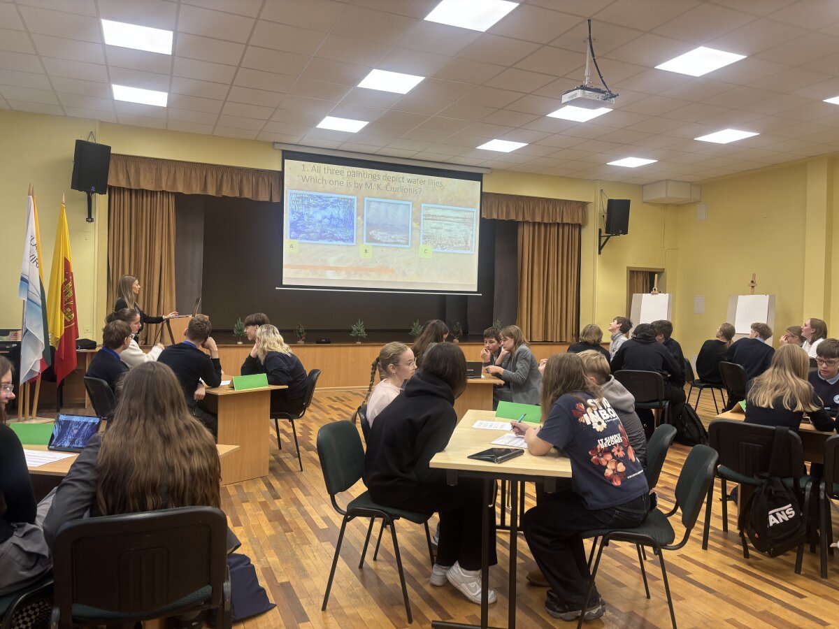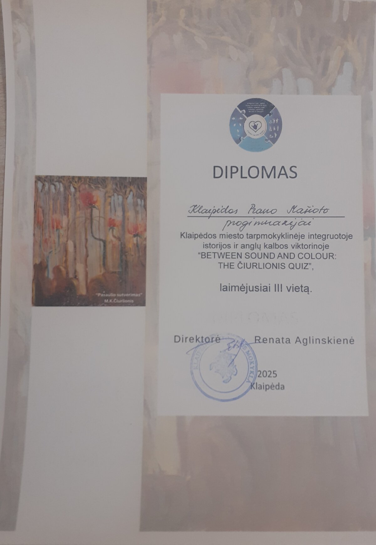 Lapkričio 28 dieną mieste vyko tarpmokyklinė integruota istorijos ir anglų kalbos viktorina „Tarp garso ir spalvos: viktorina apie Čiurlionį“, skirta Lietuvos kompozitoriaus, dailininko Mikalojaus Konstantino Čiurlionio 150-osioms gimimo metinėms paminėti. Mūsų mokyklos komandą sudarė Andrėja P. 7b kl., Ignas O. 7b kl., Adrija P. 8c kl., ir Andrėja M. 8a kl., kurie laimėjo III vietą. Sveikiname komandą ir didžiuojamės jų puikiu pasiekimu!