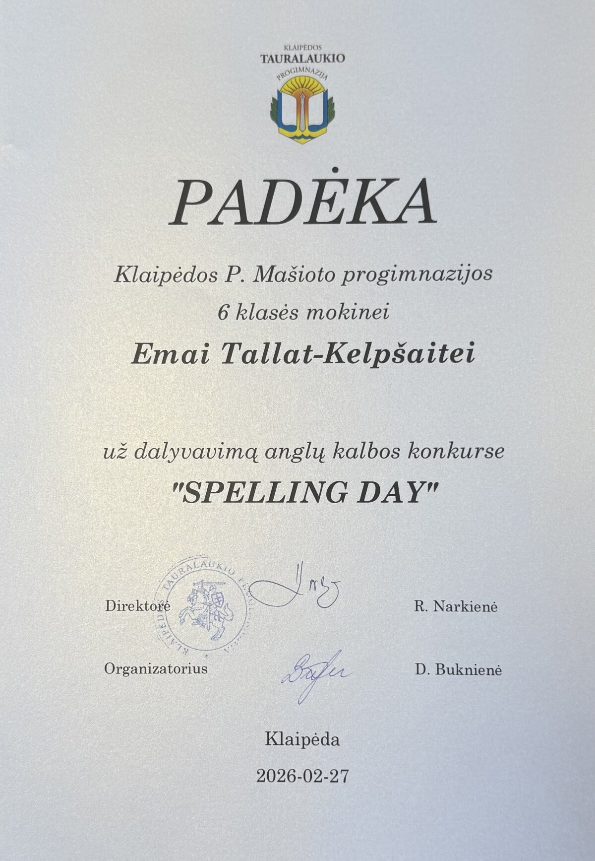 Prano Mašioto progimnazijos 6 klasės mokinės dalyvavo Klaipėdos miesto mokyklų 6 klasių mokinių anglų kalbos konkurse „Spelling Day“, kuriame demonstravo anglų kalbos žinias, taisyklingą žodžių rašybą bei gebėjimą susikaupti ir drąsiai atstovauti mokyklai.