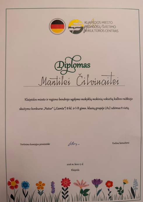 Kovo 17 d. Klaipėdos miesto ir regiono bendrojo ugdymo mokyklų vokiečių kalbos raiškiojo skaitymo konkurse „Natur“ (Gamta) ji iškovojo 1 vietą 8 klasių ir I–II gimnazijos klasių A2 lygio grupėje!