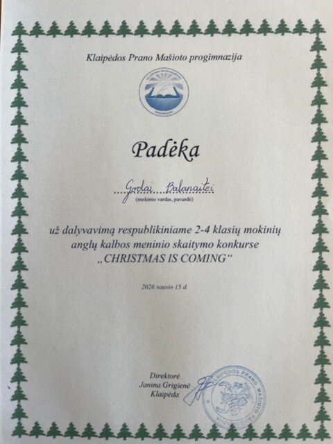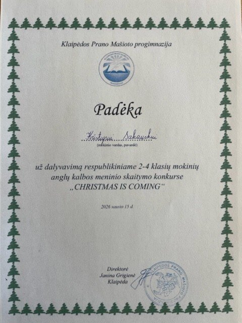 Gruodžio–sausio mėnesiais Prano Mašioto progimnazija organizavo respublikinį 2–4 klasių mokinių anglų kalbos meninio skaitymo konkursą „Christmas is coming“. Labai džiaugiamės gausiu dalyvių skaičiumi, mokinių drąsa, kūrybiškumu ir nuoširdžiais pasirodymais.