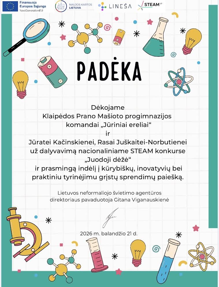 Klaipėdos Prano Mašioto progimnazijos 7a klasės mokinius subūrė respublikinis STEAM projektas „Juodosios dėžės iššūkis“. Šių metų tema – „Lygių galimybių inžinerija: sprendimai mokyklai ir bendruomenei“ – kvietė mokinius pastebėti realias problemas savo aplinkoje ir pasiūlyti idėjas, kurios padėtų kurti patogesnę, saugesnę ir visiems prieinamesnę mokymosi aplinką. Projektas sulaukė didelio susidomėjimo – iš viso užsiregistravo 133 komandos. Kovo mėnesį mokiniai analizavo savo mokyklų kasdienybę, stebėjo, su kokiais iššūkiais susiduria bendruomenė, ir ieškojo sprendimų, galinčių turėti realų poveikį mokinių bei mokytojų aplinkai.
